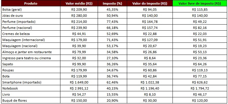 O estudo foi desenvolvido com base no Impostômetro, plataforma que calcula a incidência tributária sobre produtos e serviços comercializados no Brasil. Confira todos os itens na tabela disponibilizada pelo IBGPT.